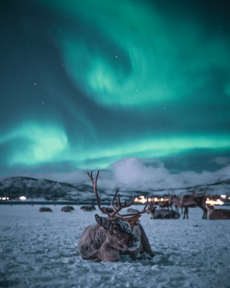 You’ll then feed a herd of 300 reindeer and try your hand at lasso throwing before gathering inside a warm, candlelit gamme for a traditional three-course Sami dinner featuring bidos stew, salmon, and dessert — with vegetarian, vegan, and gluten-free options available.